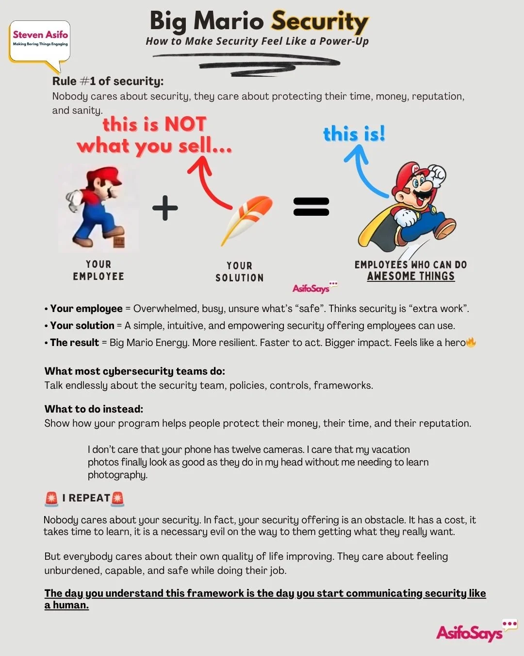 That’s Big Mario Energy: when the security program acts like a power-up that helps them get further, faster.
