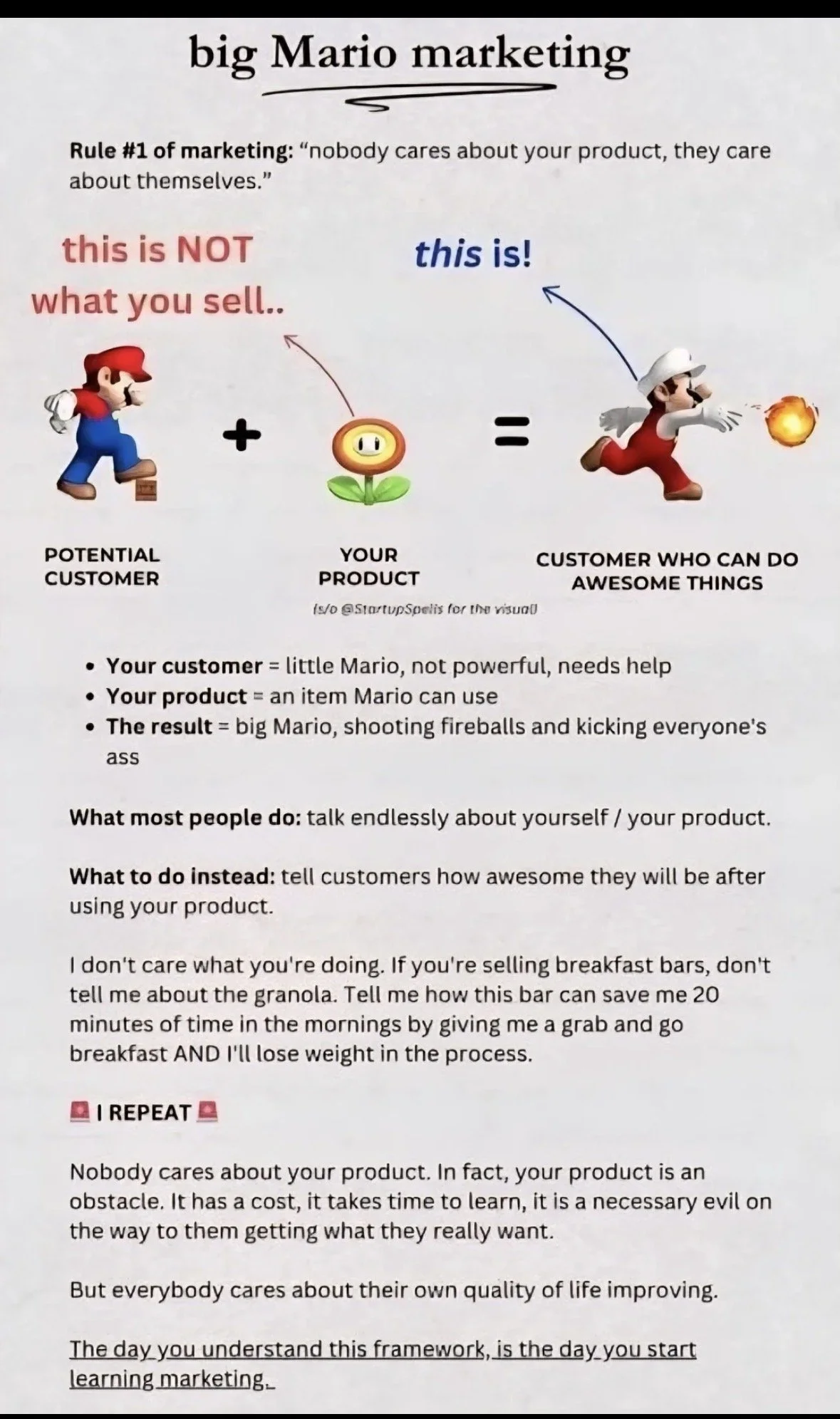 This whole framework was inspired by a brilliant concept I stumbled upon called on Twitter (X?) Big Mario Marketing.